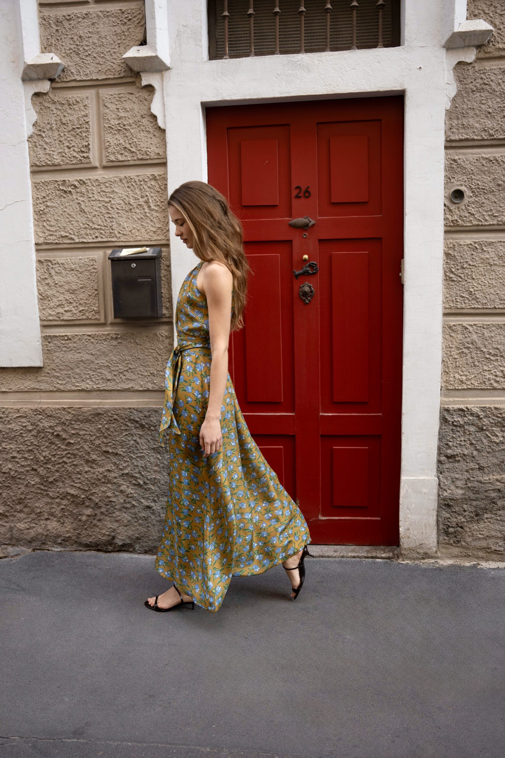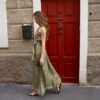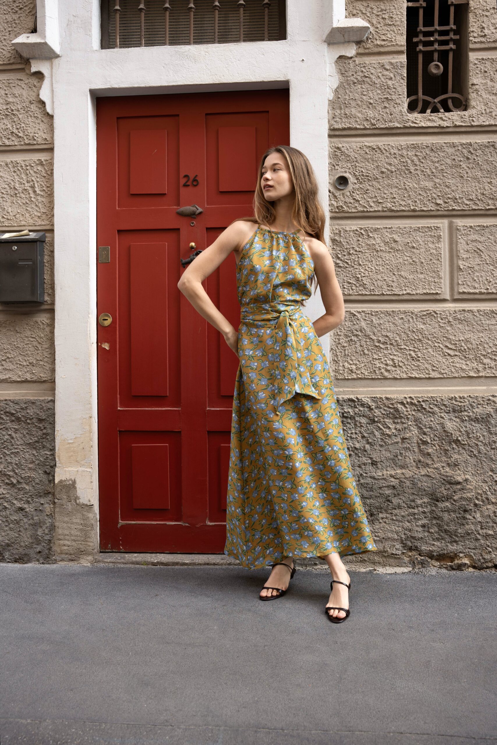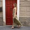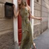 Abito con scollo halter in pura seta, si stringe in vita con la cintura abbinata e scivola morbido fino alla caviglia, ondeggiando e splendendo ad ogni passo. La bellezza della stampa e la morbidezza della seta rendono questo abito di un’eleganza eterea, perfetto per la sera e per cerimonie. Questo capo è artigianale.