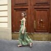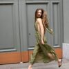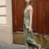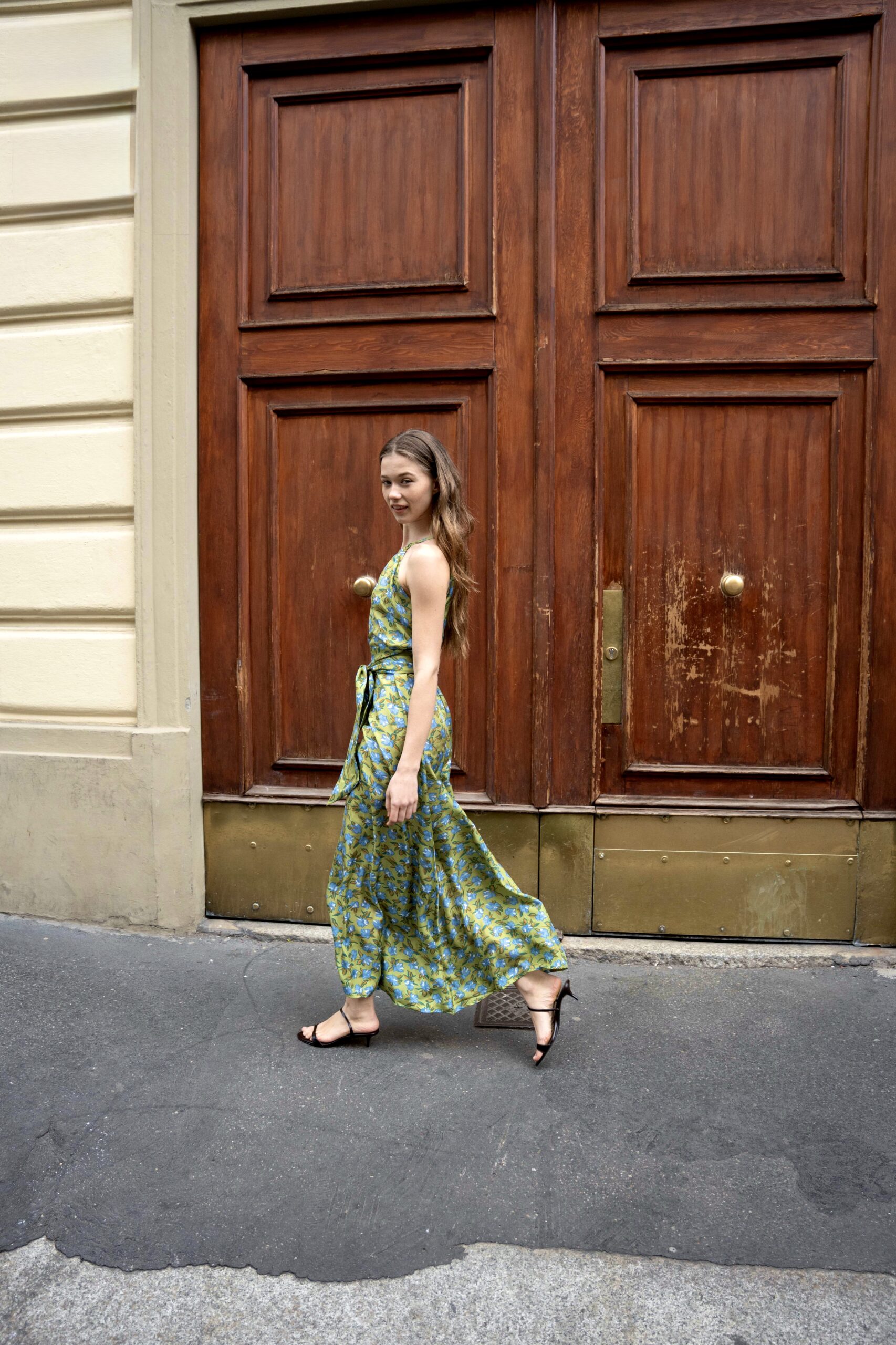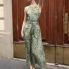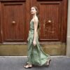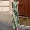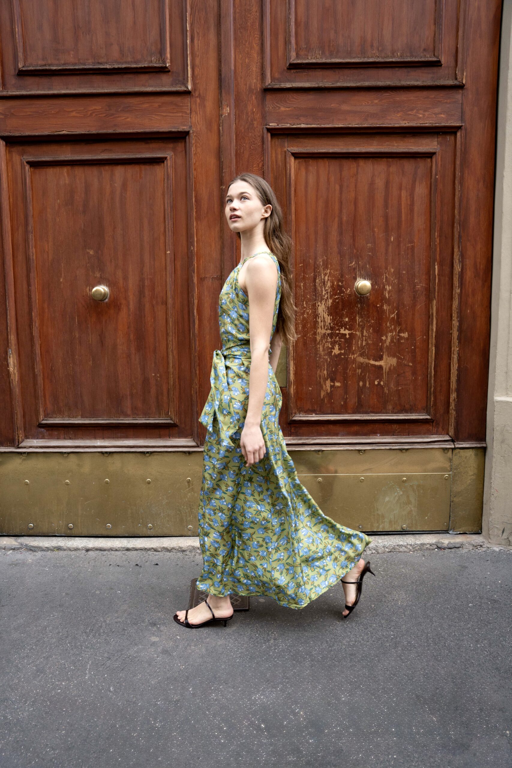 Abito con scollo halter in pura seta, si stringe in vita con la cintura abbinata e scivola morbido fino alla caviglia, ondeggiando e splendendo ad ogni passo. La bellezza della stampa e la morbidezza della seta rendono questo abito di un’eleganza eterea, perfetto per la sera e per cerimonie. Questo capo è artigianale.